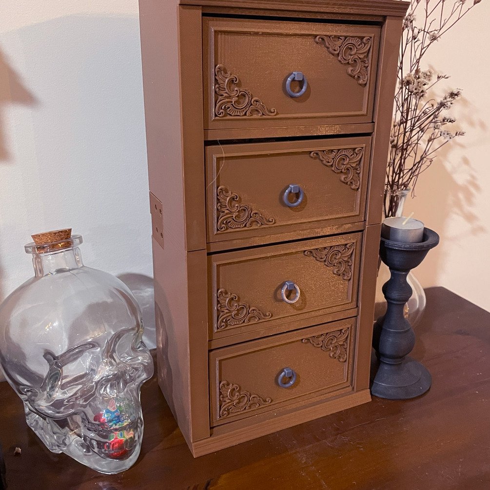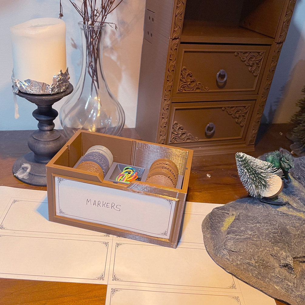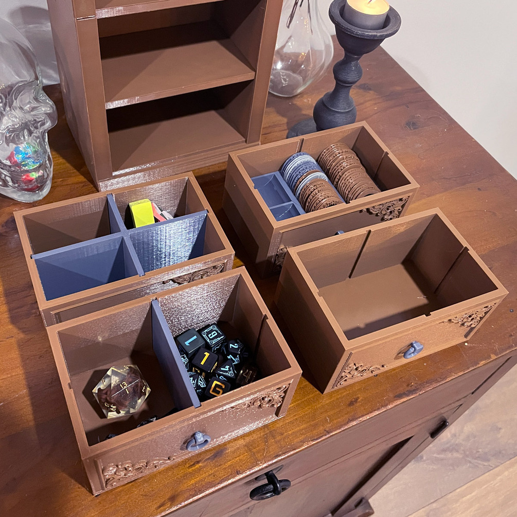 Mini drawers will accomodate all of your game accessories, from minis to decks of cards or even stuff that your household or craft projects might need: keys, screws, sewing accessories or anything else that has to be organized!