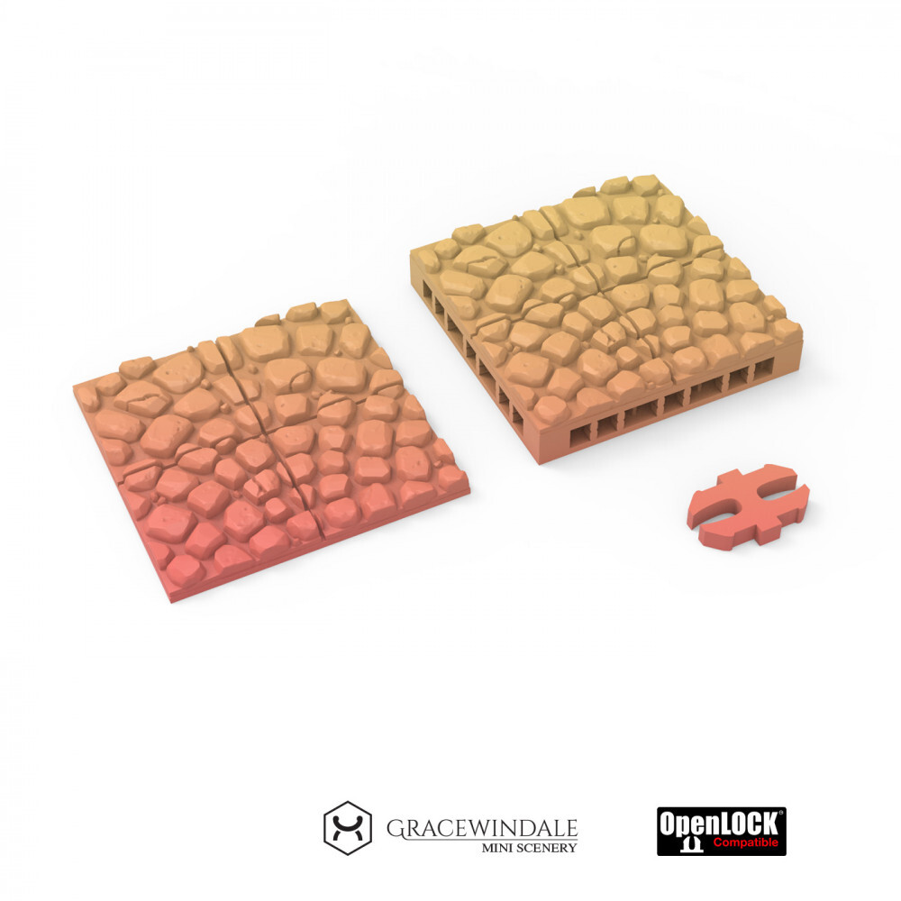 All tiles are 2x2 inches and have 2 options: thin base and OpenLock (_OL.stl) compatible base. Props without attached tile base are included as well.